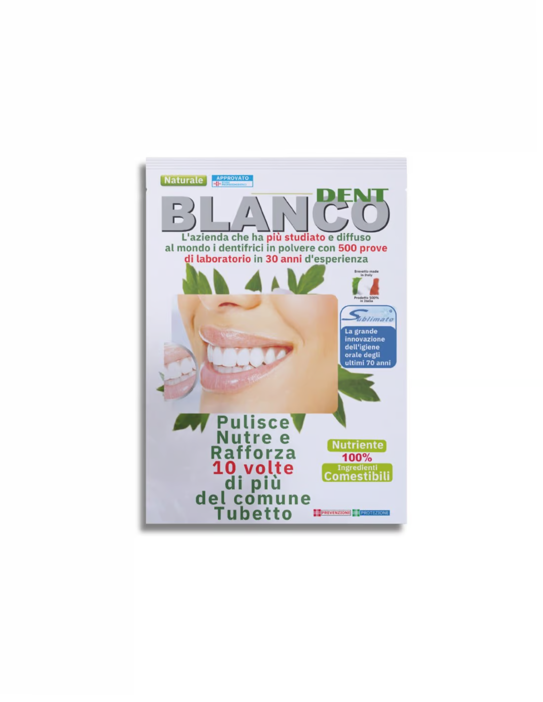 Blancodent non contiene sostanze chimiche dannose per la salute, schiumogeni, anestetici, antimuffa e antibiotici.