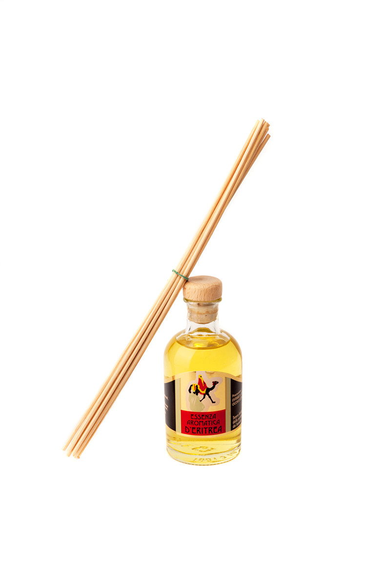 Vasetto di vetro trasparente che ricorda per forma gli antichi flaconi utilizzati dalle farmacie d’inizio ‘900, contenente 100ml di Essenza Aromatica d’Eritrea che permette ai bastoncini naturali di bambù che lo accompagnano di esserne imbevuti per regalare oltre 30 giorni di inimitabile fragranza. Ogni diffusore è confezionato in un’elegante scatola regalo.