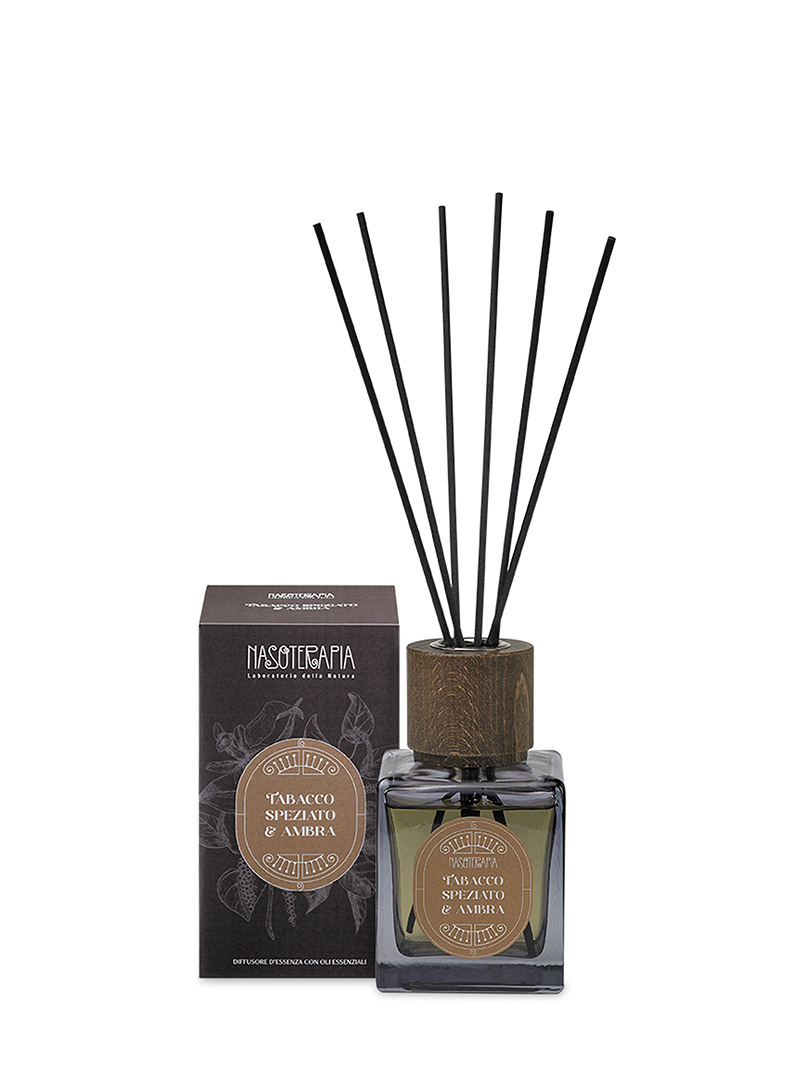 Il misterioso profumo dell’Ambra si fonde con le note speziate del Tabacco dando vita a una fragranza sensuale e magnetica che, sprigionandosi in modo naturale e costante dal diffusore a bastoncini rende ogni ambiente caldo e avvolgente.