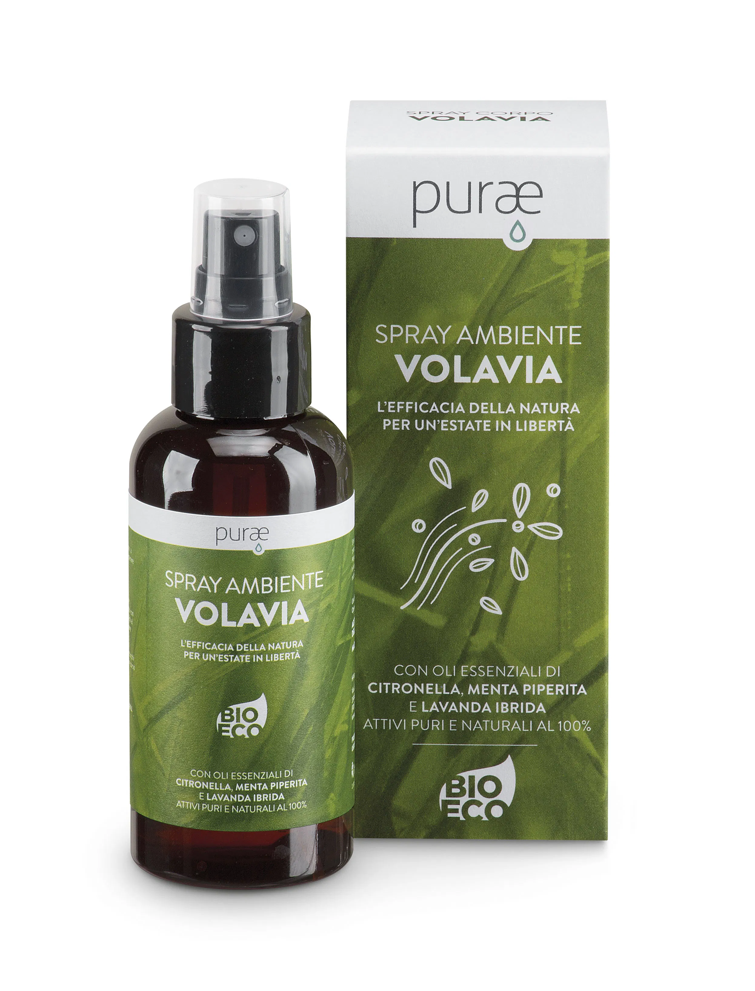 Purae VolaVia Spray Ambiente prodotto con alcol vegetale e arricchidito da oli essenziali di Citronella, Menta Piperita e Lavanda Ibrida (attivi puri e naturali al 100%) ed estratti biologici di basilico e rosmarino.